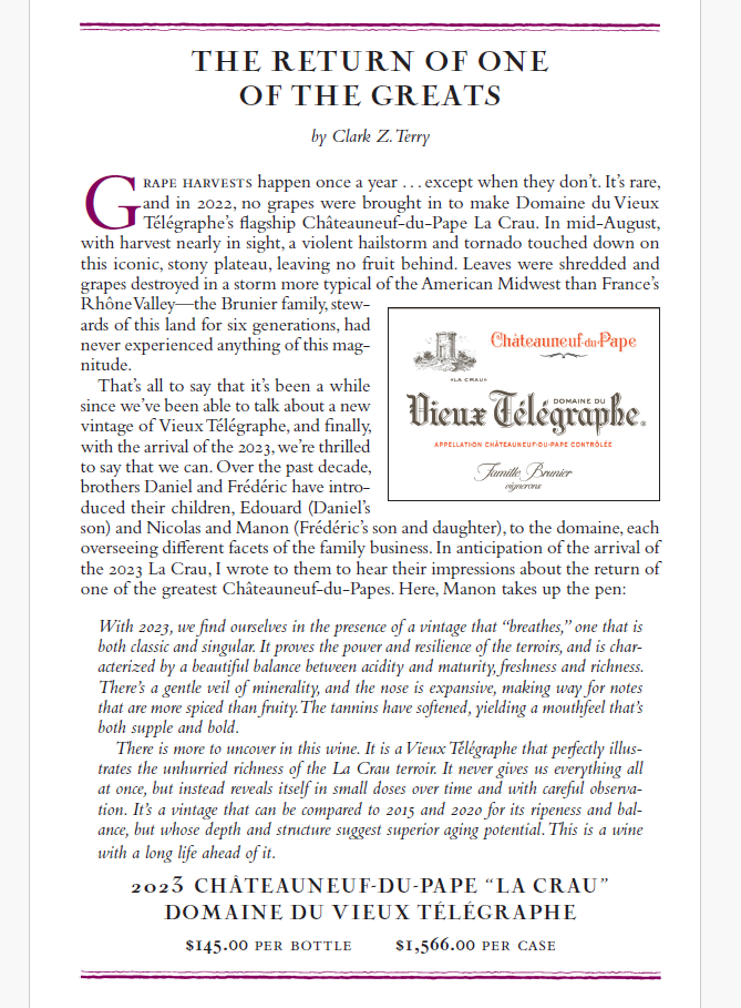 « Grape harvests happen once a year . . . except when they don’t. It’s rare, and in 2022, no grapes were brought in to make Domaine du Vieux Télégraphe’s flagship Châteauneuf-du-Pape La Crau. In mid-August, with harvest nearly in sight, a violent hailstorm and tornado touched down on this iconic, stony plateau, leaving no fruit behind. Leaves were shredded and grapes destroyed in a storm more typical of the American Midwest than France’s